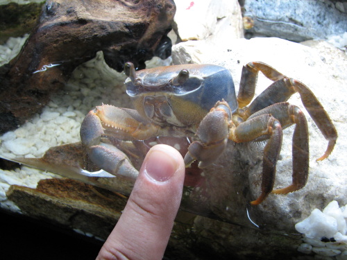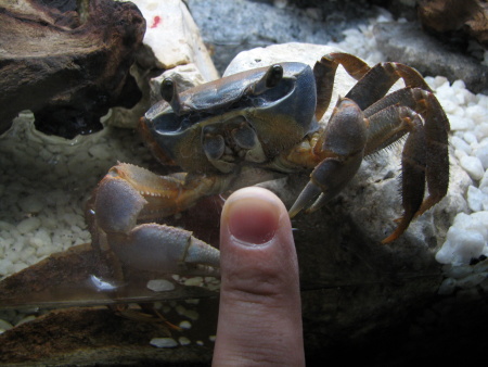 | Tak toto je můj krab Klepetko. Ptáte se proč takové jméno? Je to úplně jednoduché :)! Když jsme si ho vezli domů v plastové krabičce na manželčiným klíně, tak pořád poklepával klepetem na víčko a dno krabičky. Po příjezdu domů - před nastěhováním do jeho domečku taky každou chvíli klepal. No a když vylezl z krabičky a začal rekognoskaci svého nového území, tak chodil po obvodu akvária a jemně poklepával po skle... Proto tedy Klepetko... PS: Mimochodem - po skle poklepává furt... ;-) A proč tyto stránky? Protože jsem na webu o tomto tvorovi našel velice málo a hned při hledáni mi došlo, že je to třeba změnit. Takže proto... V menu vpravo (které si můžete přesunout jak je libo) najdete odkazy na další stránky o mém nezbedovi. No a zde základní údaje: